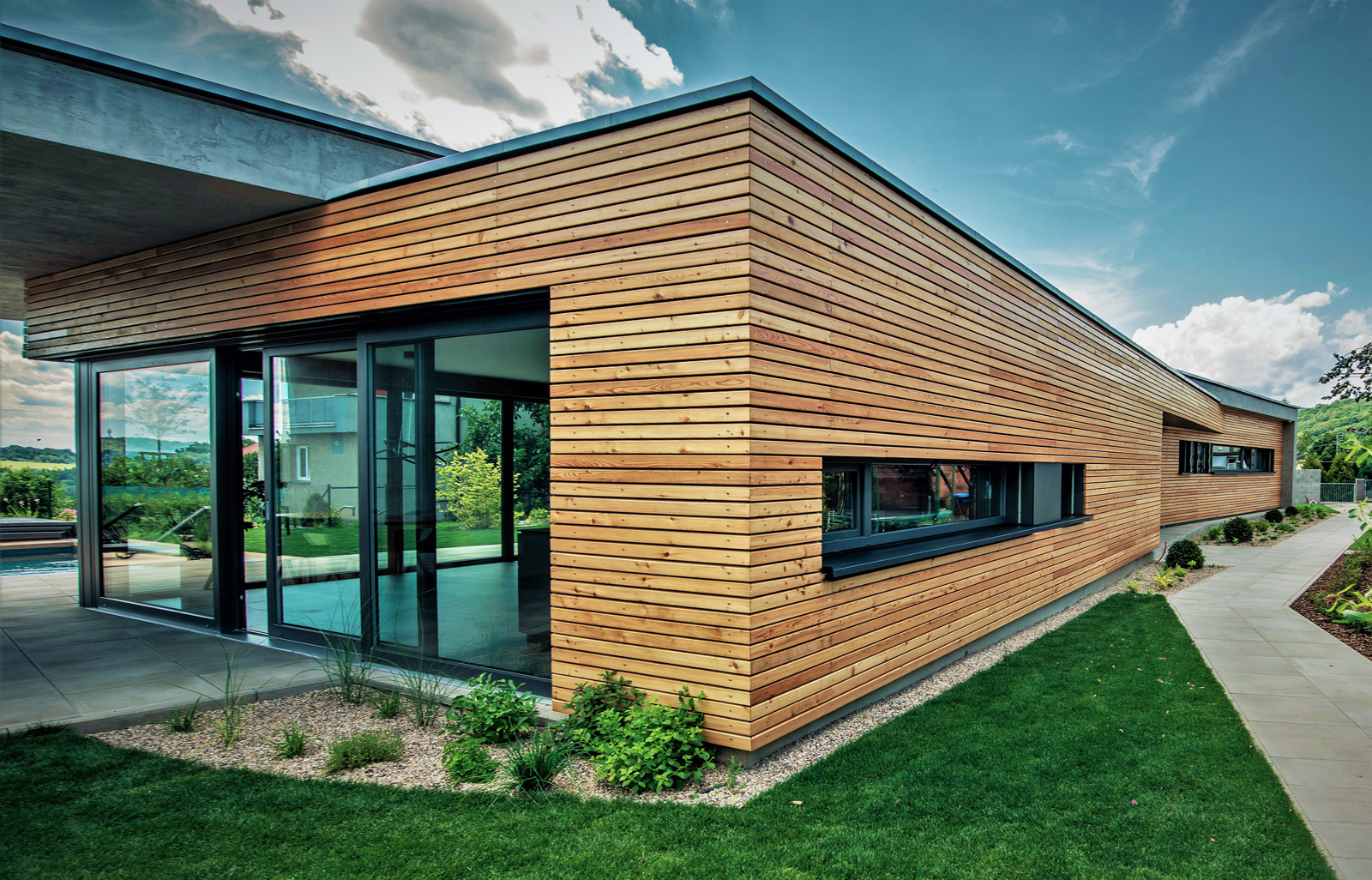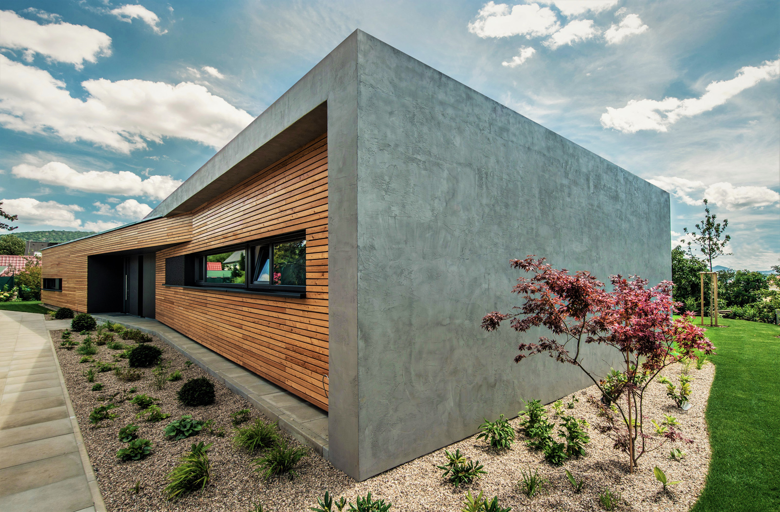Architektonické řešení pracuje s čistým horizontálním objemem, ze kterého vystupuje dřevěná obytná část. Tento jemný „úkrok stranou“ není pouze formálním gestem — vytváří krytou terasu a plynulý přechod mezi interiérem a zahradou. Pod stabilním horizontálním rámem se dům dynamicky otevírá směrem do zahrady. Dřevěná část interiéru přirozeně ustupuje parteru domu a vytváří chráněný venkovní prostor, který rozšiřuje obytnou plochu domu směrem ven.
