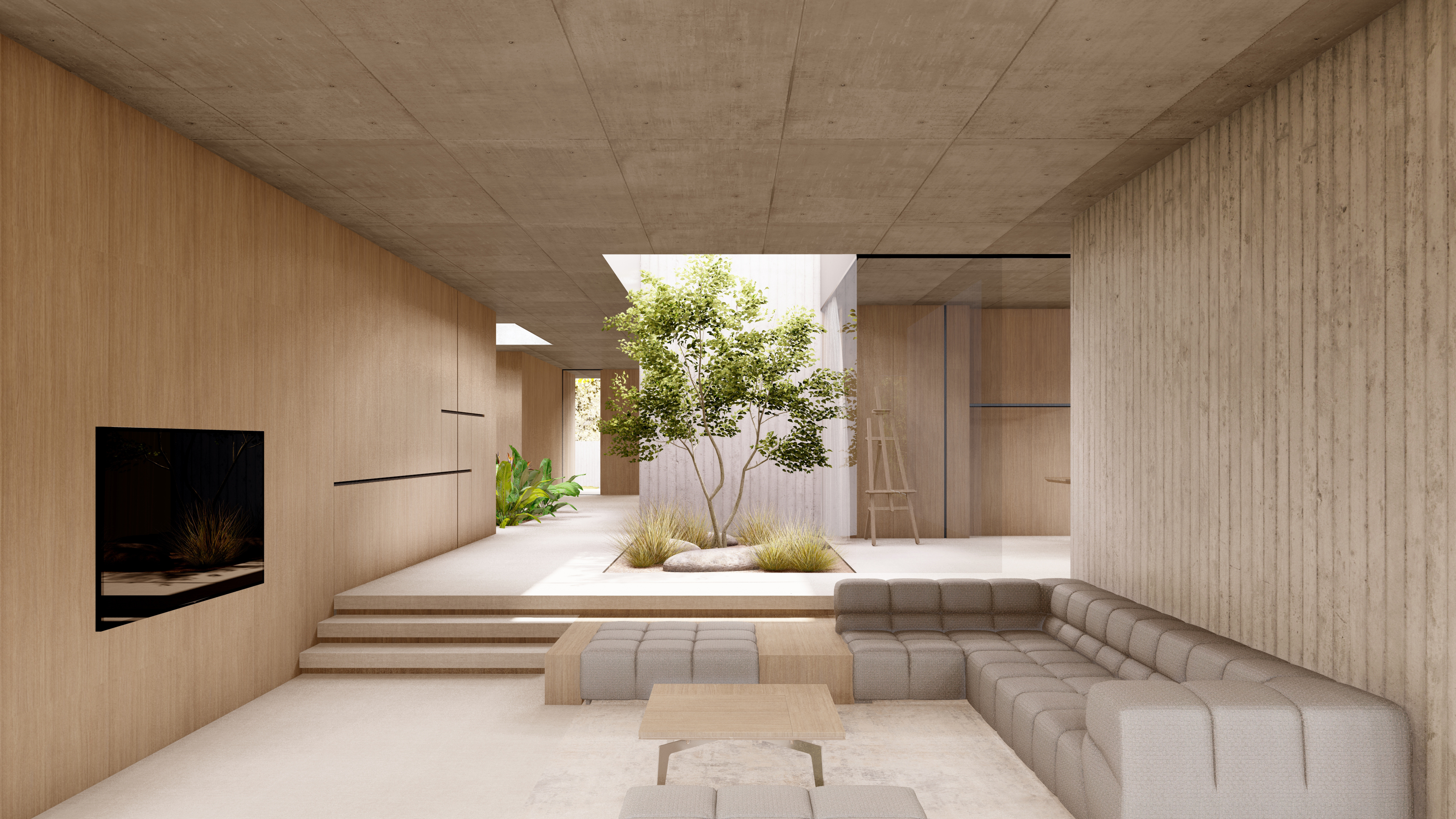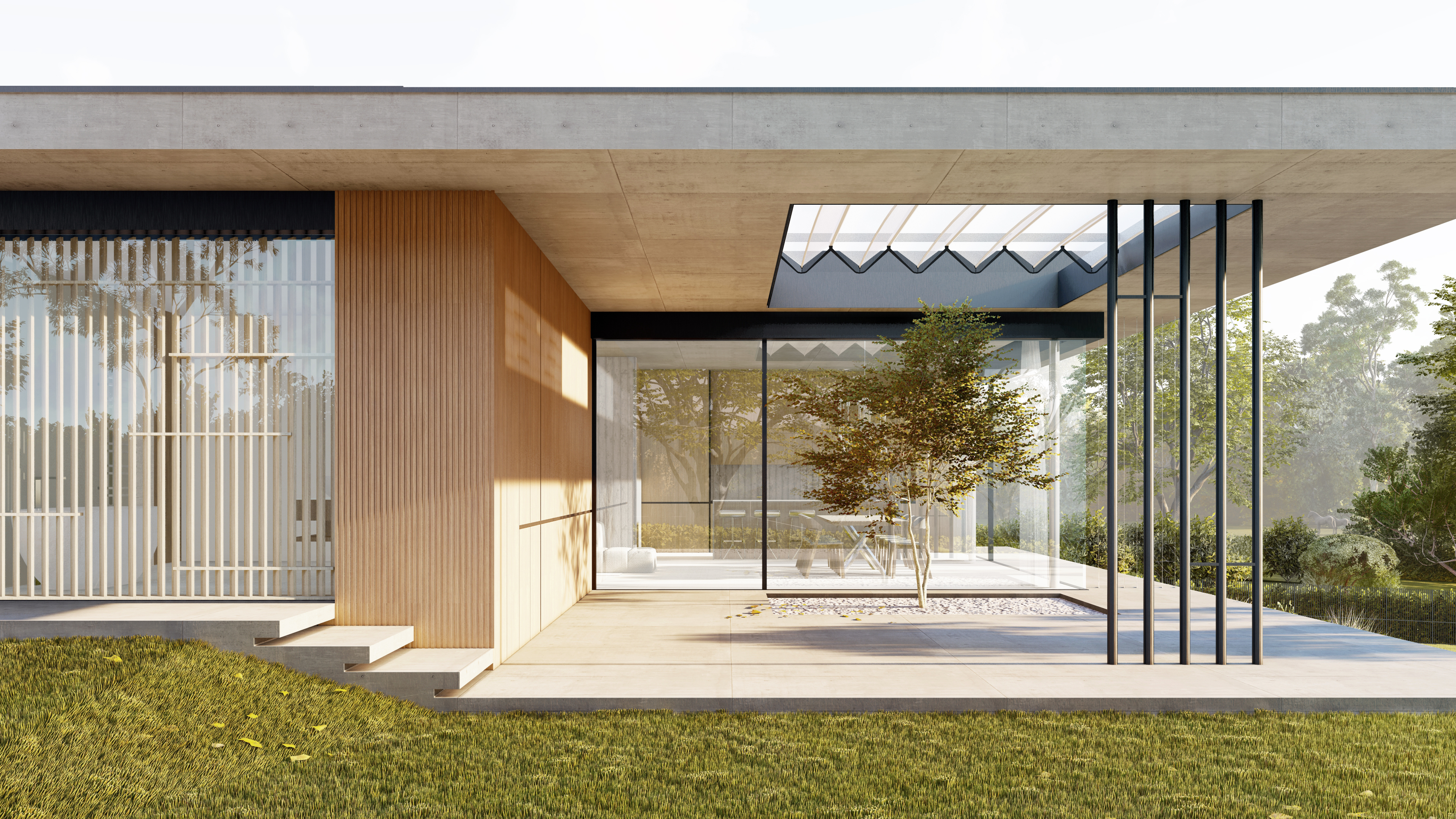 Dispoziční řešení vily je otevřené, přehledné a maximálně funkční. Centrálním bodem domu je velkorysý obytný prostor s jídelnou, který se prostřednictvím celoprosklených stěn plynule propojuje se zahradou a krytými terasami. Interiér a exteriér zde netvoří dva světy — ale jeden celek. Dům se přirozeně přizpůsobuje rytmu dne, ročnímu období i životnímu stylu svých obyvatel.