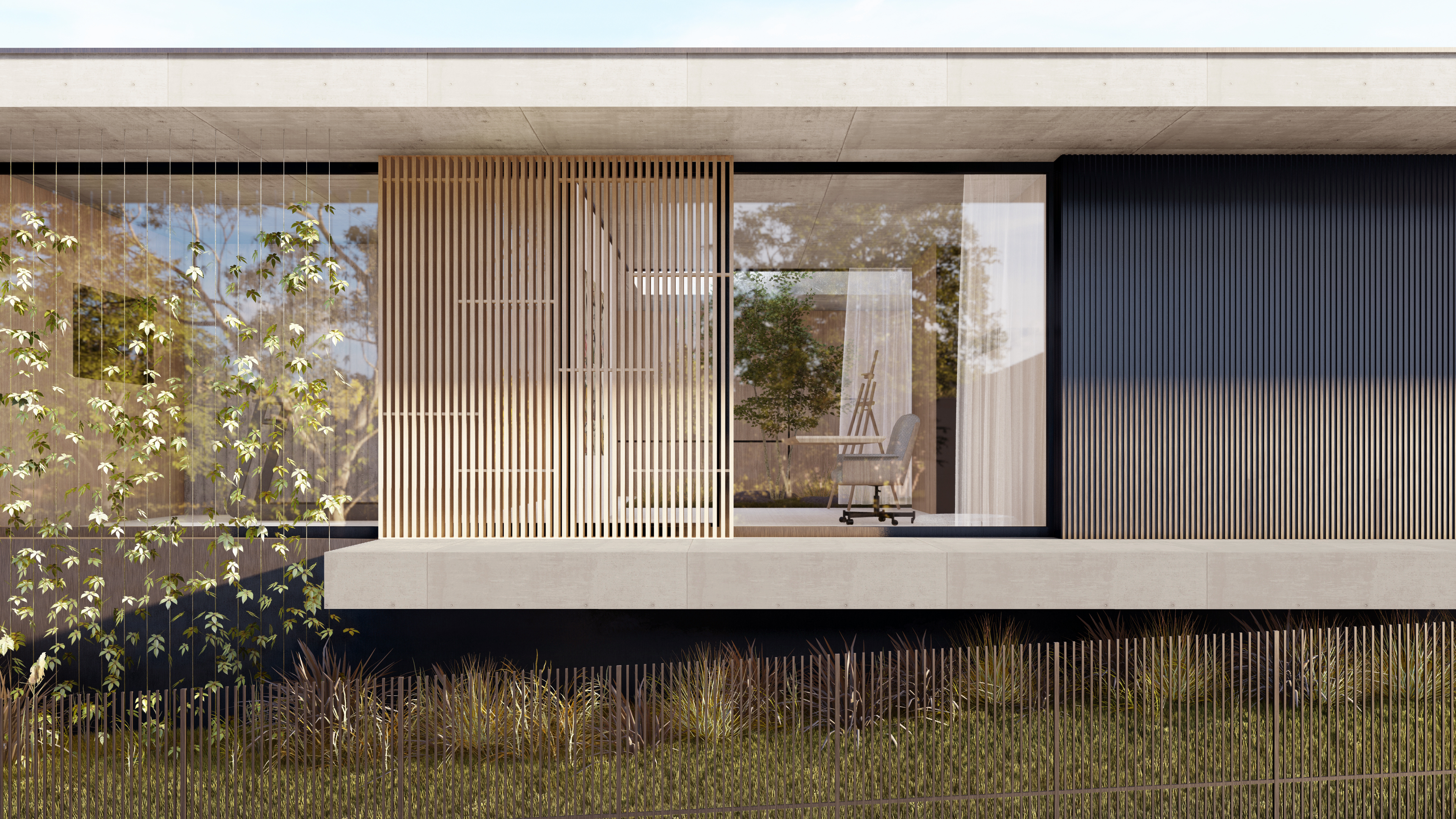 Hmotové řešení domu vychází z horizontální kompozice jednopodlažní vily s výraznými přesahy ploché střechy. Ty dodávají stavbě lehkost, optickou rovnováhu a zároveň plní praktickou roli pasivního stínění, které zvyšuje komfort bydlení po celý rok. Architektura respektuje měřítko místa a nepůsobí okázale — naopak přirozeně zapadá do okolního prostředí a nechává vyniknout kvalitu prostoru, světla a materiálu.